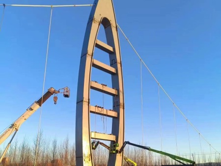 钢丝绳主缆:在桥梁工程中一般选用直径5.2毫米粗的高强度镀锌钢丝加工而成的钢丝绳,头尾两端采用热铸锚进行锚固,与桥梁构架索股相连接。而吊杆常常采用高强度的钢绞线衔接在主缆上的锁夹之上,然后吊起整个桥面进而承受整个桥面的荷载。